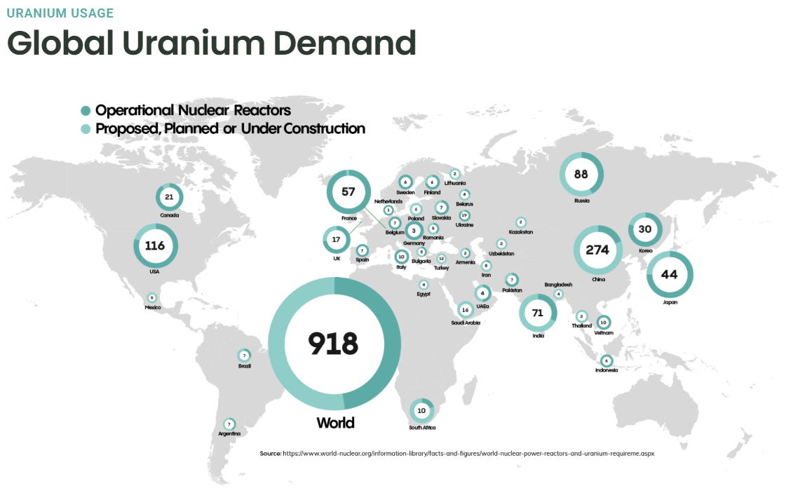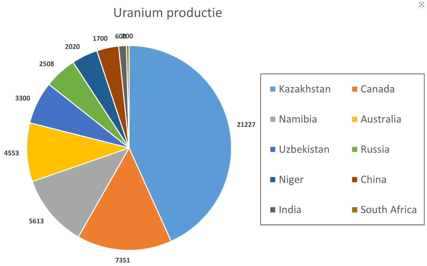 - Uranium heeft ook een grote politieke component. Productie vind veelal plaats in Kazachstan en Afrika. Rusland en China "leggen veelal beslag op deze productie". Blijft over Canada als belangrijke producent. Amerika heeft ongeveer 100 kerncentrales in gebruik, maar geen eigen productie van uranium. Amerika heeft jarenlang uranium van Rusland gekocht, maar dat is tegenwoordig niet meer voor te stellen. Uranium voor kernenergie is van nationaal veiligheidsbelang geworden. Meer en meer landen willen energie-onafhankelijk worden. En dat kan met kernenergie.